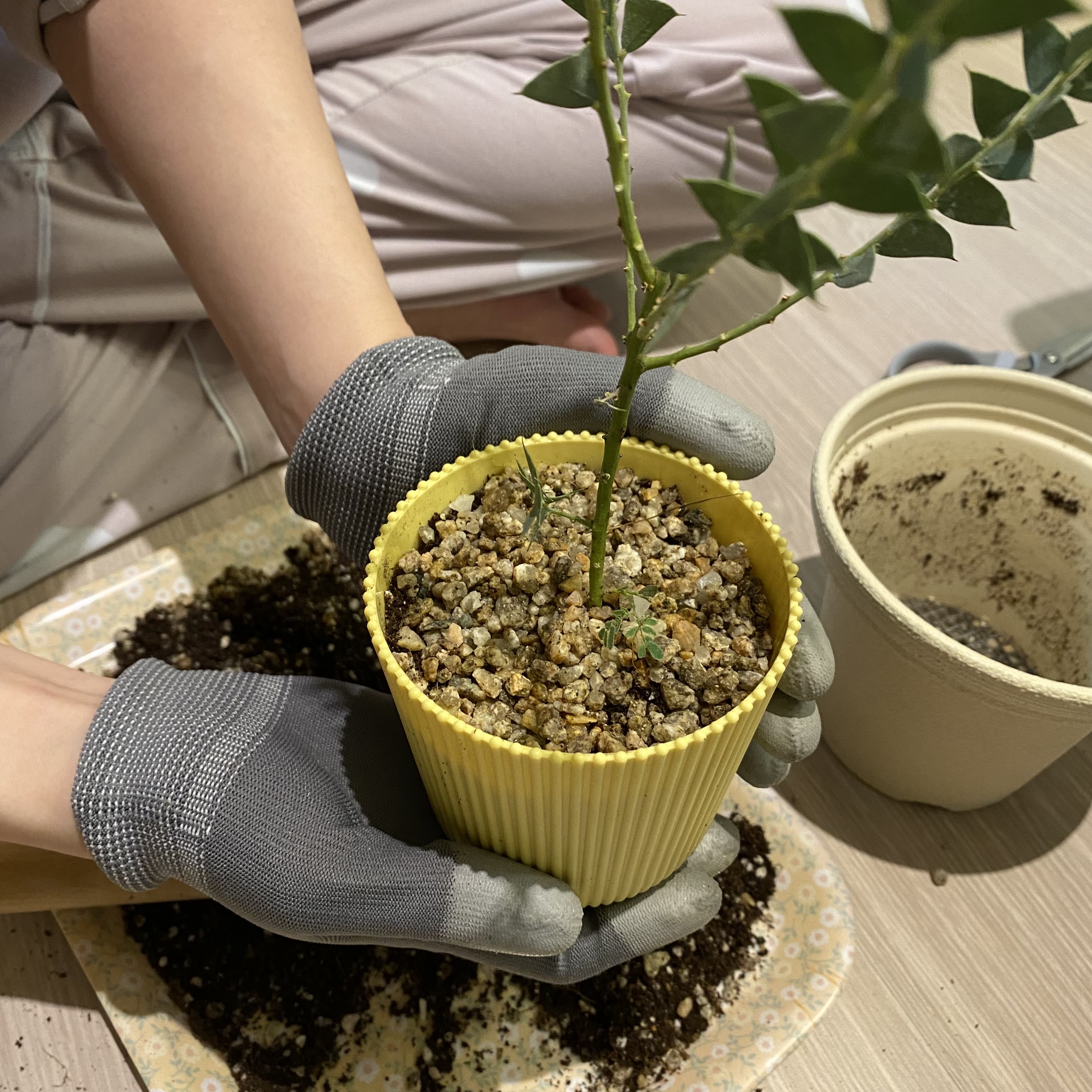 배수망을 깔고 중간 마사토를 깔아준 뒤 다육이흙을 사용했어요. 아무래도 야매로 집에서 분갈이를 하다 보니까 집에 있는 다육이흙만 사용하게 되는데 물 빠짐도 좋고 물이야 제가 자주 주면 되니까 생각해서 그냥 다육이흙을 사용했어요. 다만 흙이 가벼워서 연약한 뿌리를 가진 아카시아에게는 다소 흔들림이 있더라고요. 그래서 조금 더 꽉꽉 다져주는 형식으로 흙을 채워 넣었어요. 또 너무 세게 눌러서 묶어놓듯이 심으면 숨통이 없을까 봐 적당히 조절해서 심었습니다.